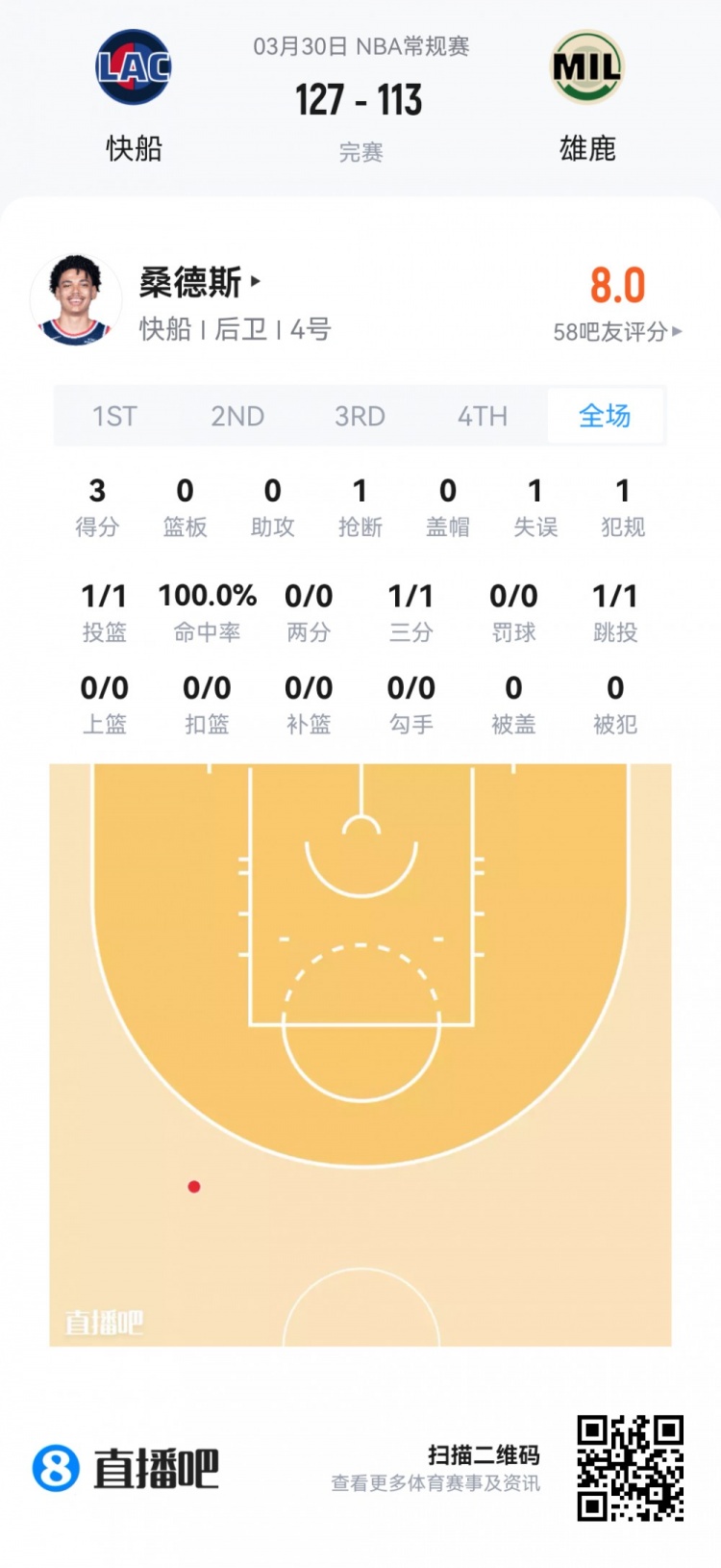 快船次轮50号秀科比·桑德斯 登场10分钟