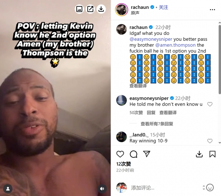 Rachaun写道:“我TM不在乎你是干啥的@KD,你最好把TM该死的球传给我的兄弟@阿门,阿门是老大,你是老二。🙂”