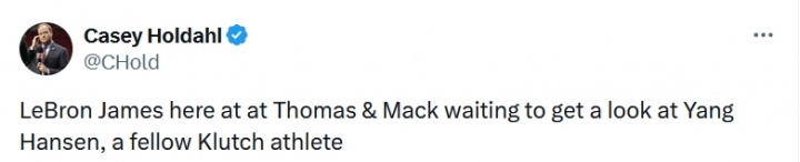 对此,开拓者记者Casey Holdahl打趣道:“詹姆斯还等着看他在Klutch Sports经纪公司的同事杨瀚森的比赛呢。😂”