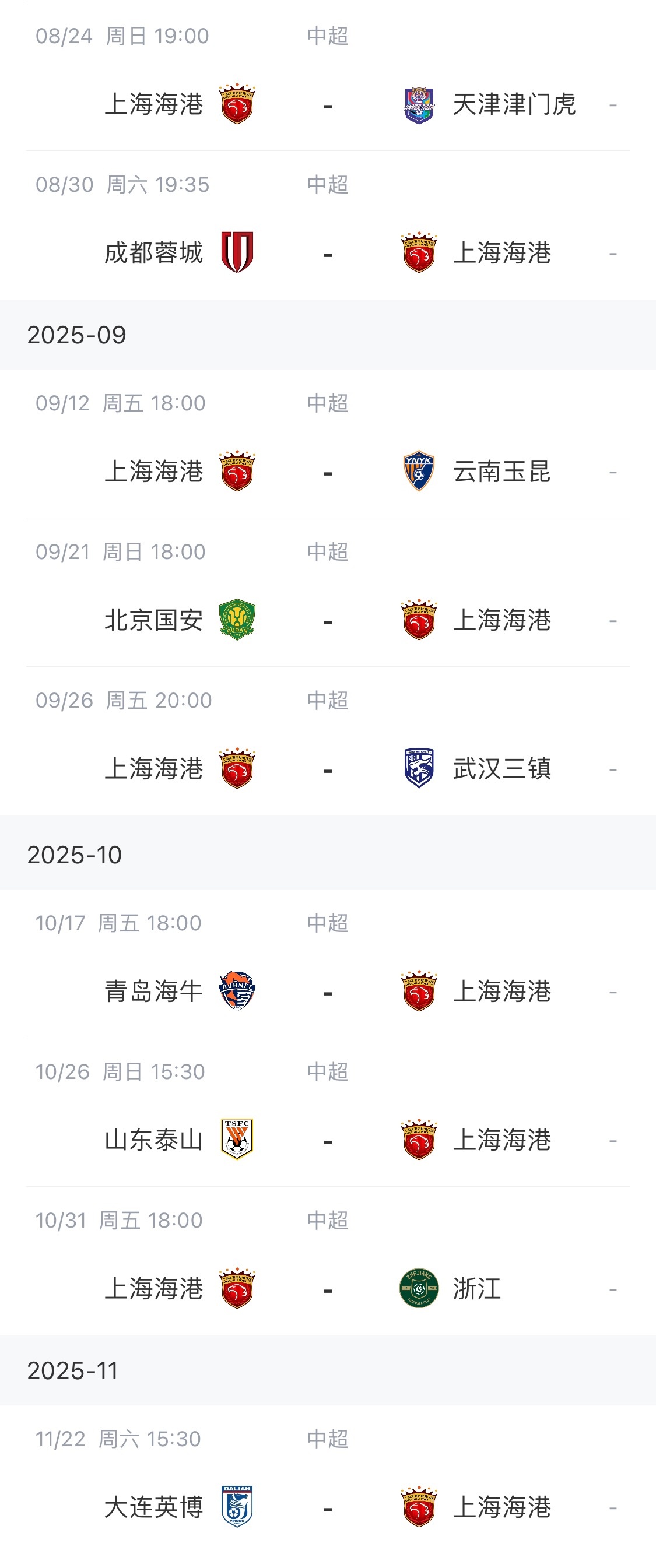 上海海港剩余联赛赛程